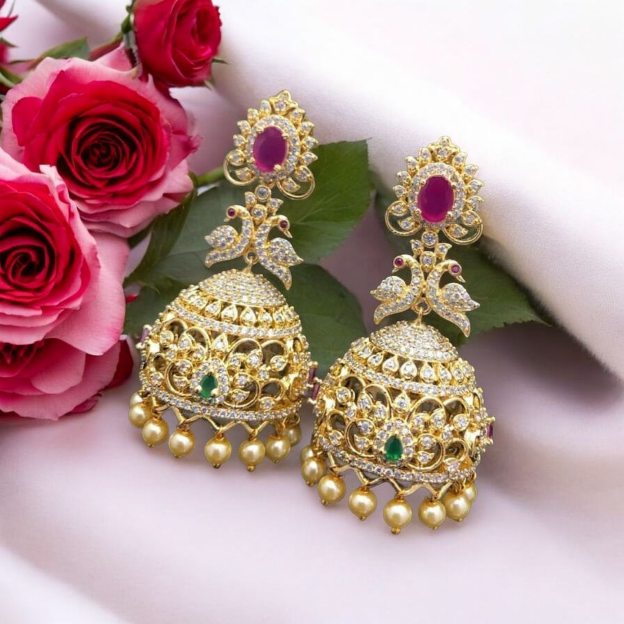 Enhance your elegance with our Premium AD Peacock Jhumkas, available in gold and silver finishes to complement any outfit and occasion. The intricate peacock feather design, adorned with sparkling crystals, adds a unique and graceful touch.