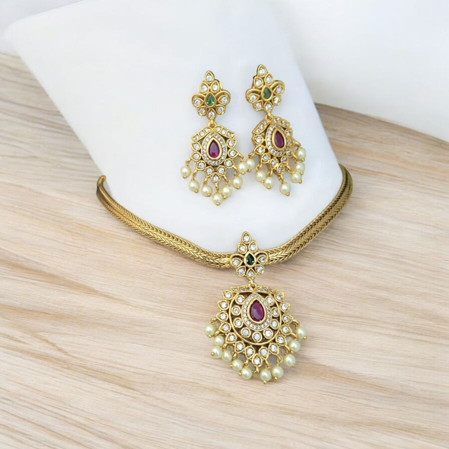 Step into tradition with the elegant Attigai Necklace, a timeless piece of South Indian temple jewelry known for its intricate craftsmanship and rich cultural significance. This choker-style necklace sits gracefully on the neck, making it an ideal choice for festive occasions, weddings, and traditional attire.