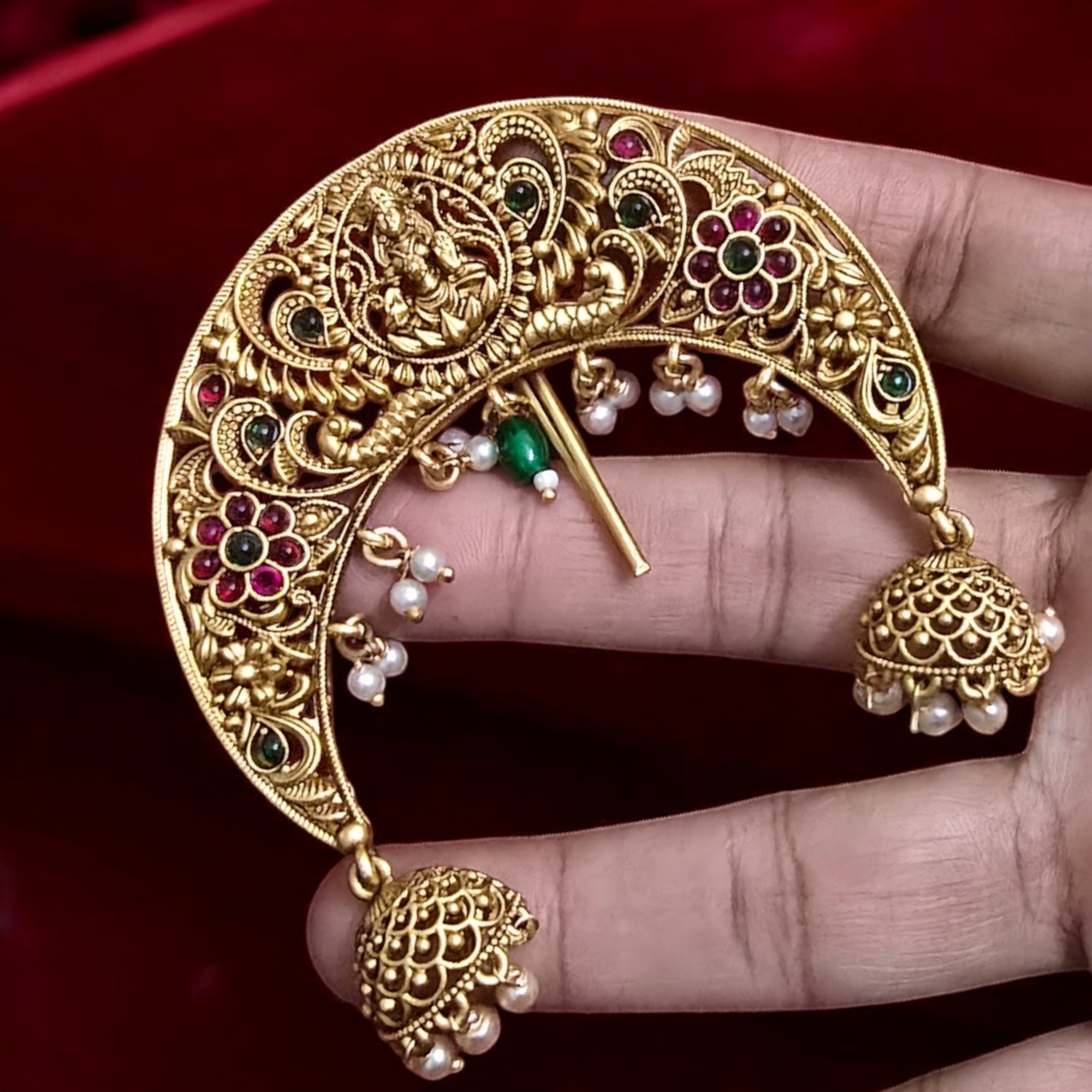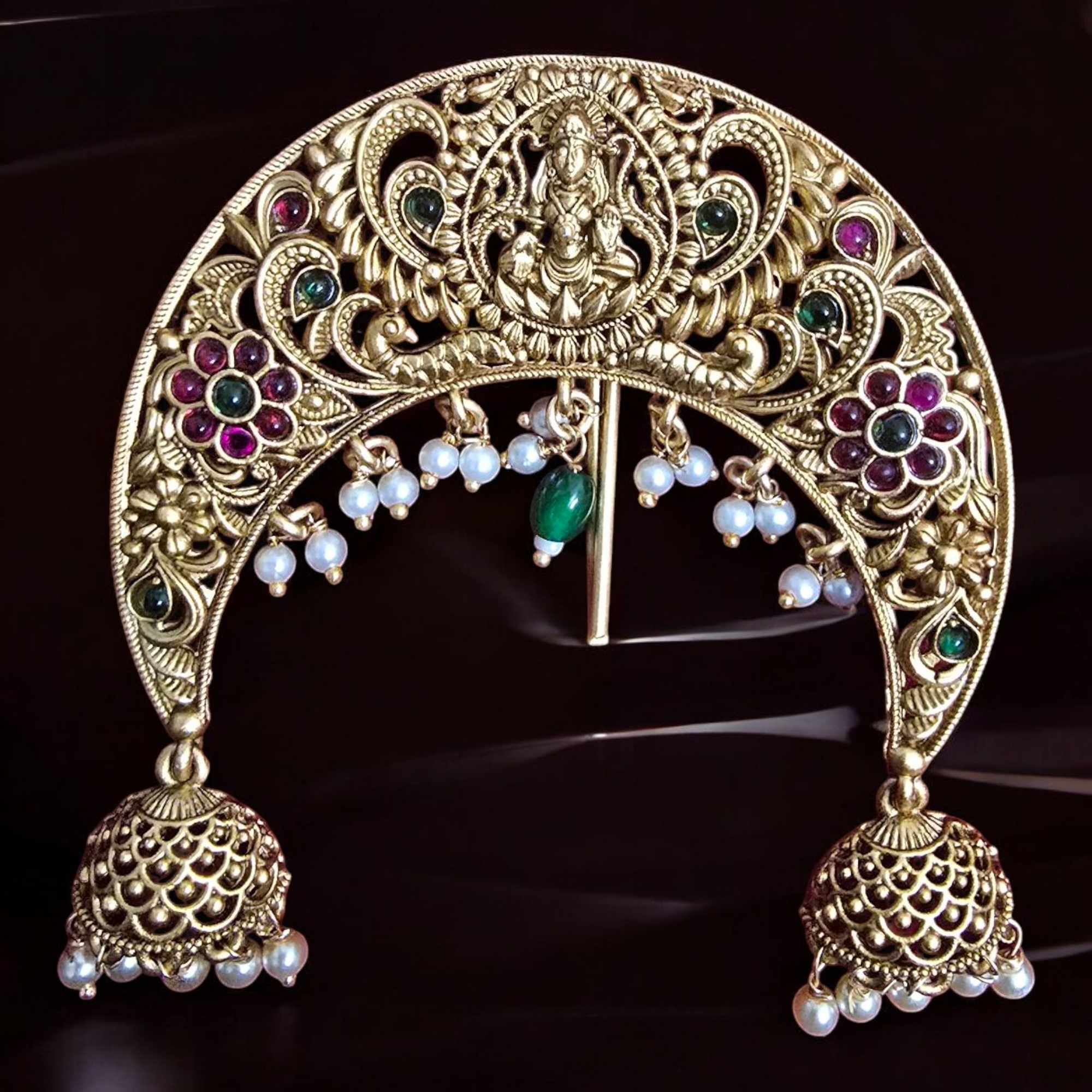 Gold-Plated Temple Juda Pin with Pearl Jhumka Drops – Traditional Hair Accessory ✨👑