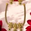 Indulge in the beauty of tradition with this Exquisite Pearl Temple Necklace Set, a masterpiece of craftsmanship and elegance. Designed with intricate temple-inspired motifs, this set features a stunning gold-plated pendant adorned with cascading pearls, creating a regal and divine aesthetic. The matching earrings complete the look, making it a perfect choice for special occasions.