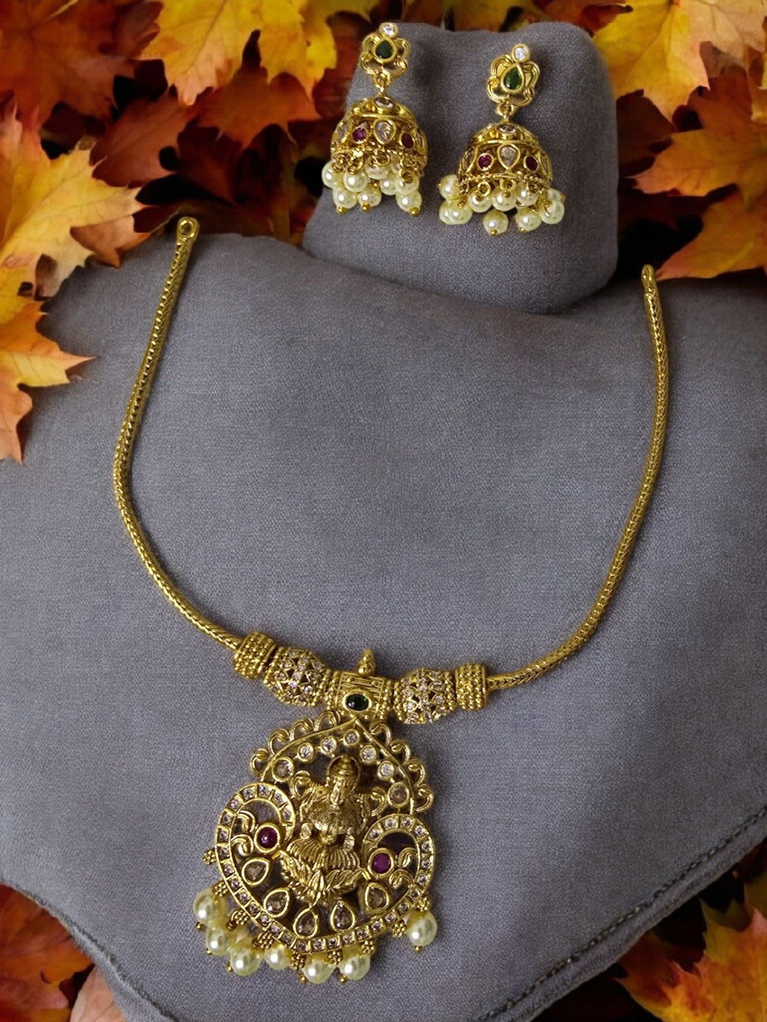 Elevate your traditional ensemble with this Antique Gold-Plated Lakshmi Temple Necklace Set, a symbol of divine grace and heritage elegance. This intricately designed set features a Goddess Lakshmi motif pendant, surrounded by dazzling Kundan stones and ruby-red embellishments. The pendant is further adorned with delicate dangling pearls, enhancing its royal aesthetic.
