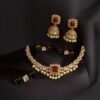 The gold-plated chain showcases fine detailing with temple-inspired engravings, providing a rich and luxurious appeal. The set is perfectly complemented by matching jhumka earrings, featuring a traditional dome shape with pearl clusters for a complete ethnic look.