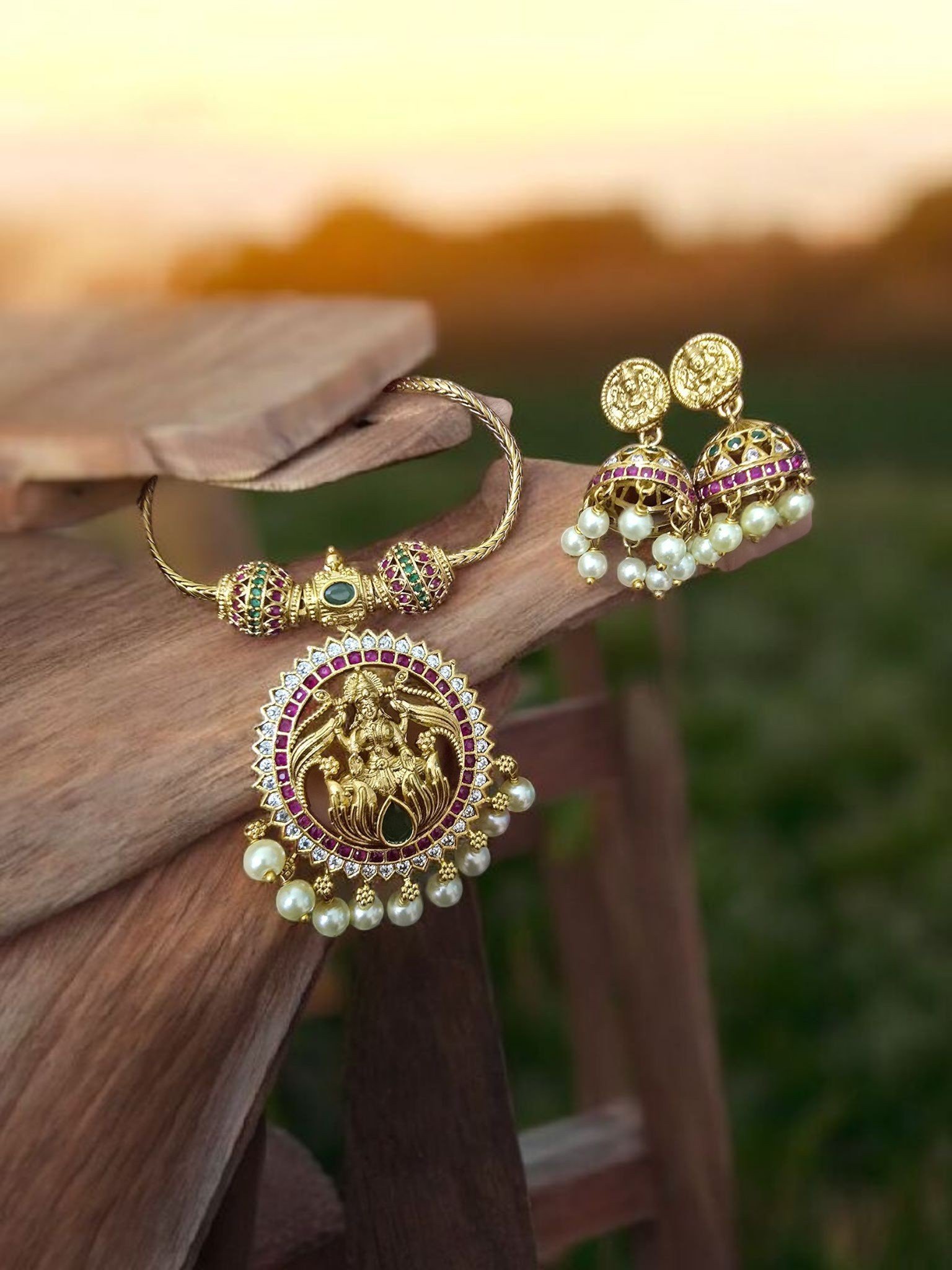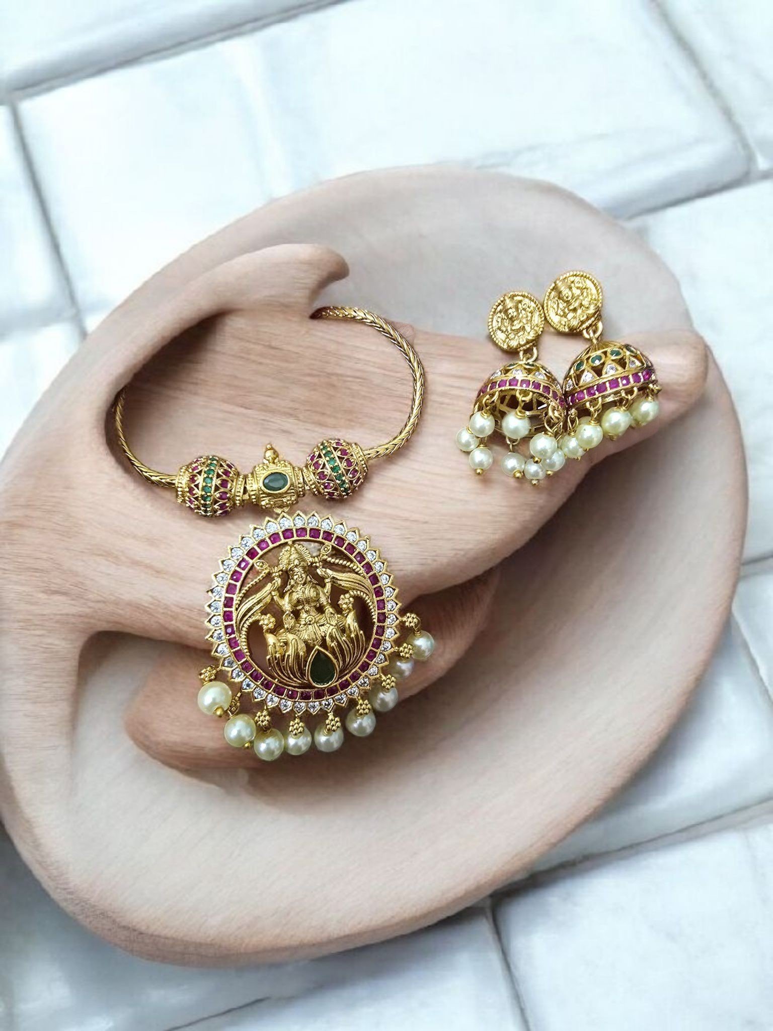 Enhance your elegance with this stunning temple jewelry set, featuring an intricately designed Goddess Lakshmi pendant and beautifully crafted jhumka earrings. Adorned with ruby stones and delicate pearl drops, this set exudes tradition and grace, making it perfect for weddings and festive occasions. Made with high-quality gold plating, intricate craftsmanship, and lightweight design, it ensures both beauty and comfort.
