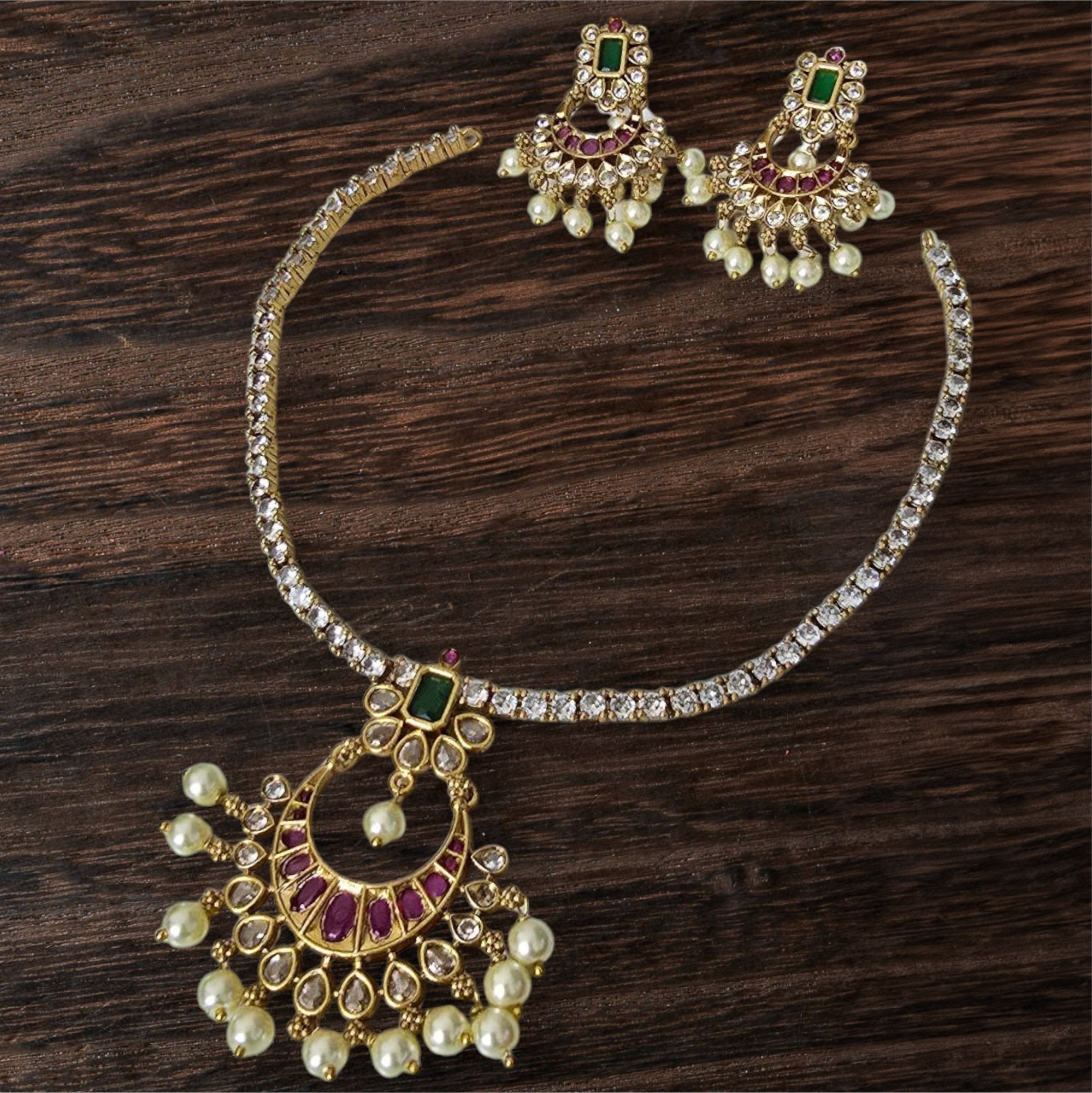 Enhance your beauty with this exquisite pearl and stone necklace set, designed to add a royal touch to your ensemble. Featuring a delicate arrangement of shimmering stones, vibrant ruby and emerald accents, and elegant pearl drops, this set is the epitome of grace and sophistication. Perfectly crafted for weddings, festive occasions, and special celebrations, it complements both traditional and contemporary outfits.