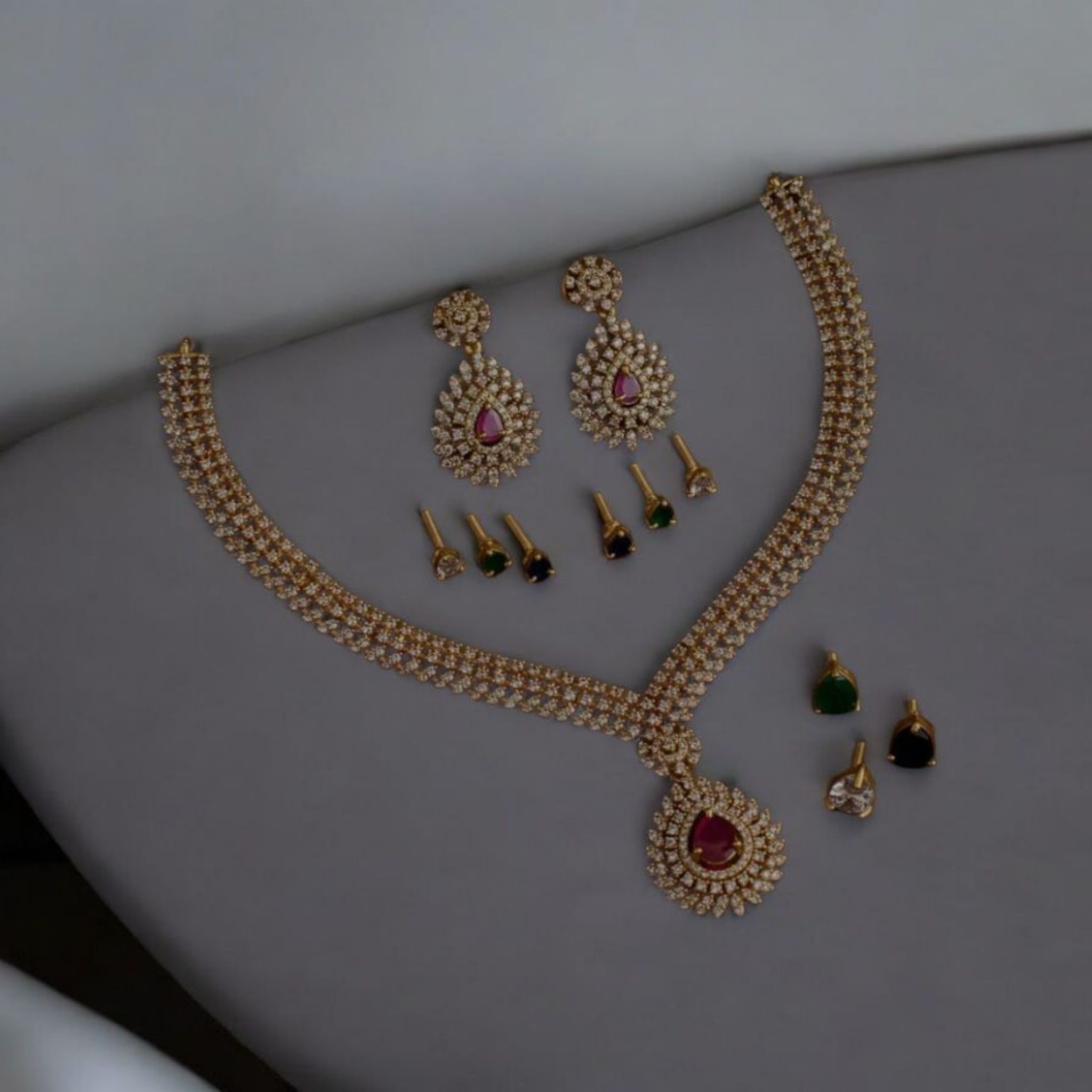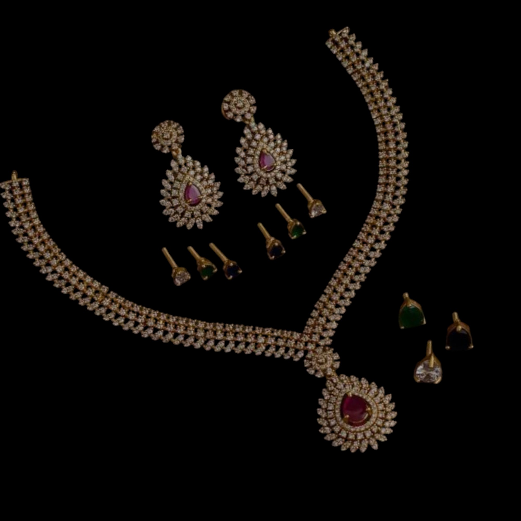 The set is complemented by matching teardrop earrings, encrusted with dazzling Kundan stones and a ruby centerpiece, ensuring a graceful and complete look. Additionally, it includes interchangeable stud earrings in emerald green, sapphire blue, black, and clear crystal, allowing you to customize your look for different occasions.